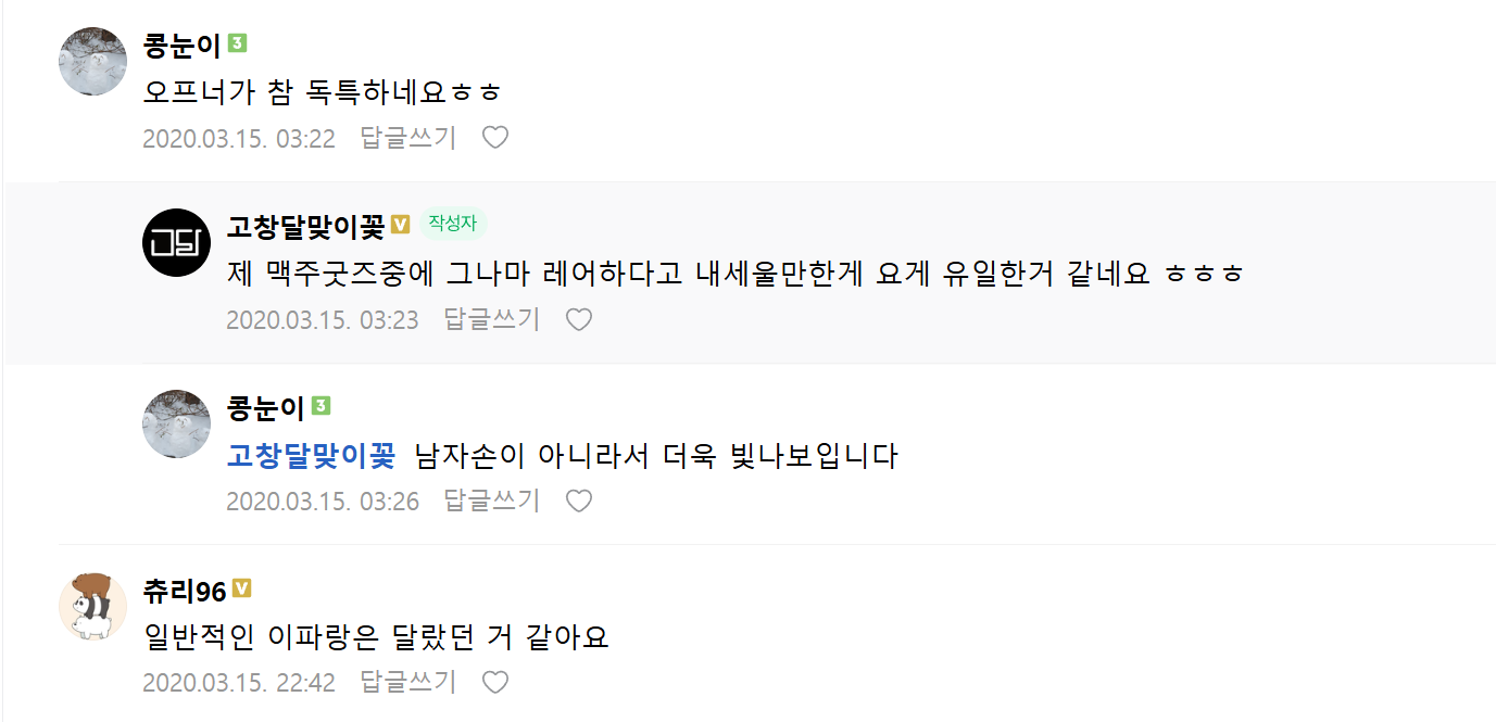 약간의 씁쓸함과 미세한 솔향을 제하면 오히려 맥아의 단맛이 끝에 더 입안에 은은하게 남는듯한 느낌을 받습니다.