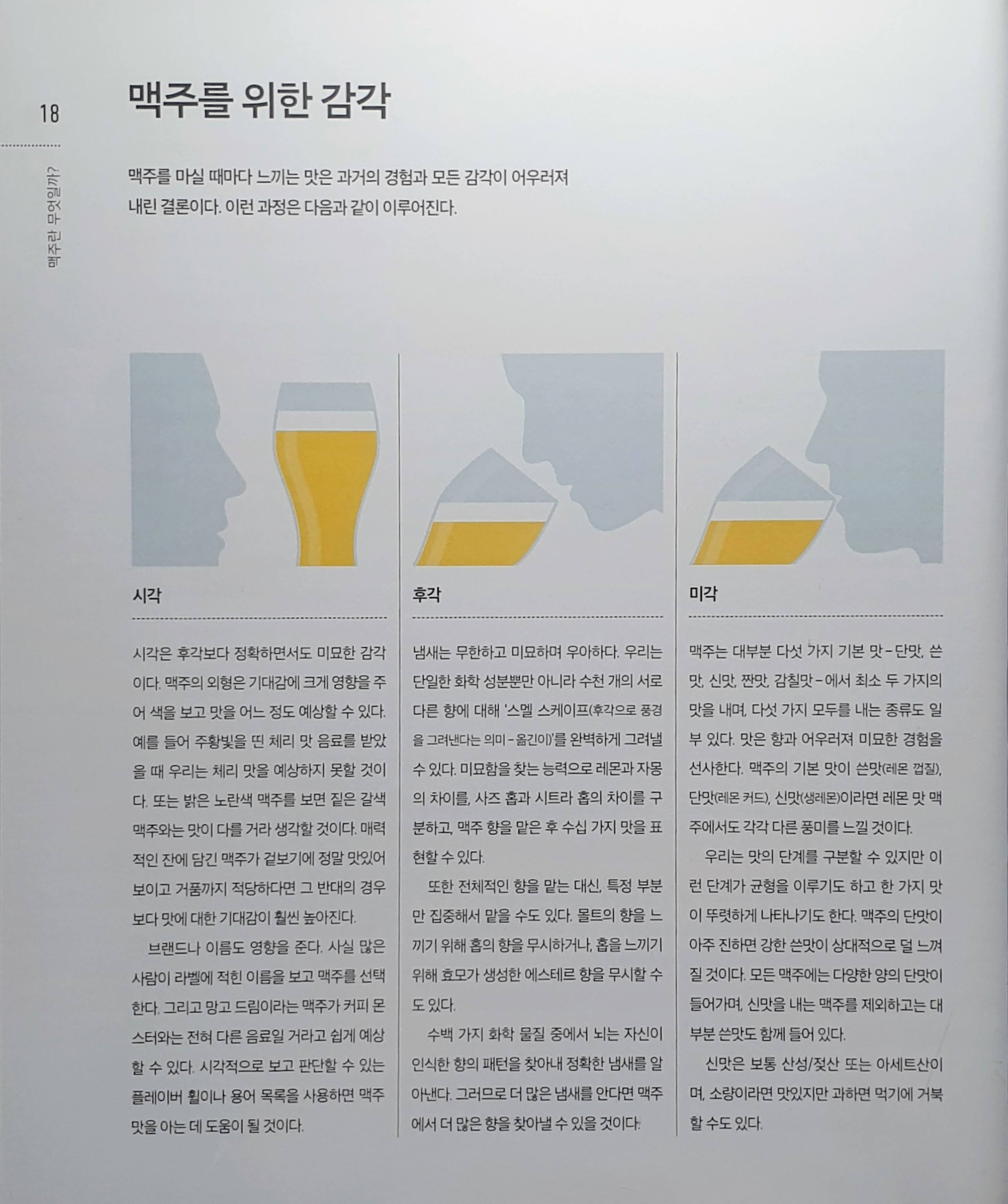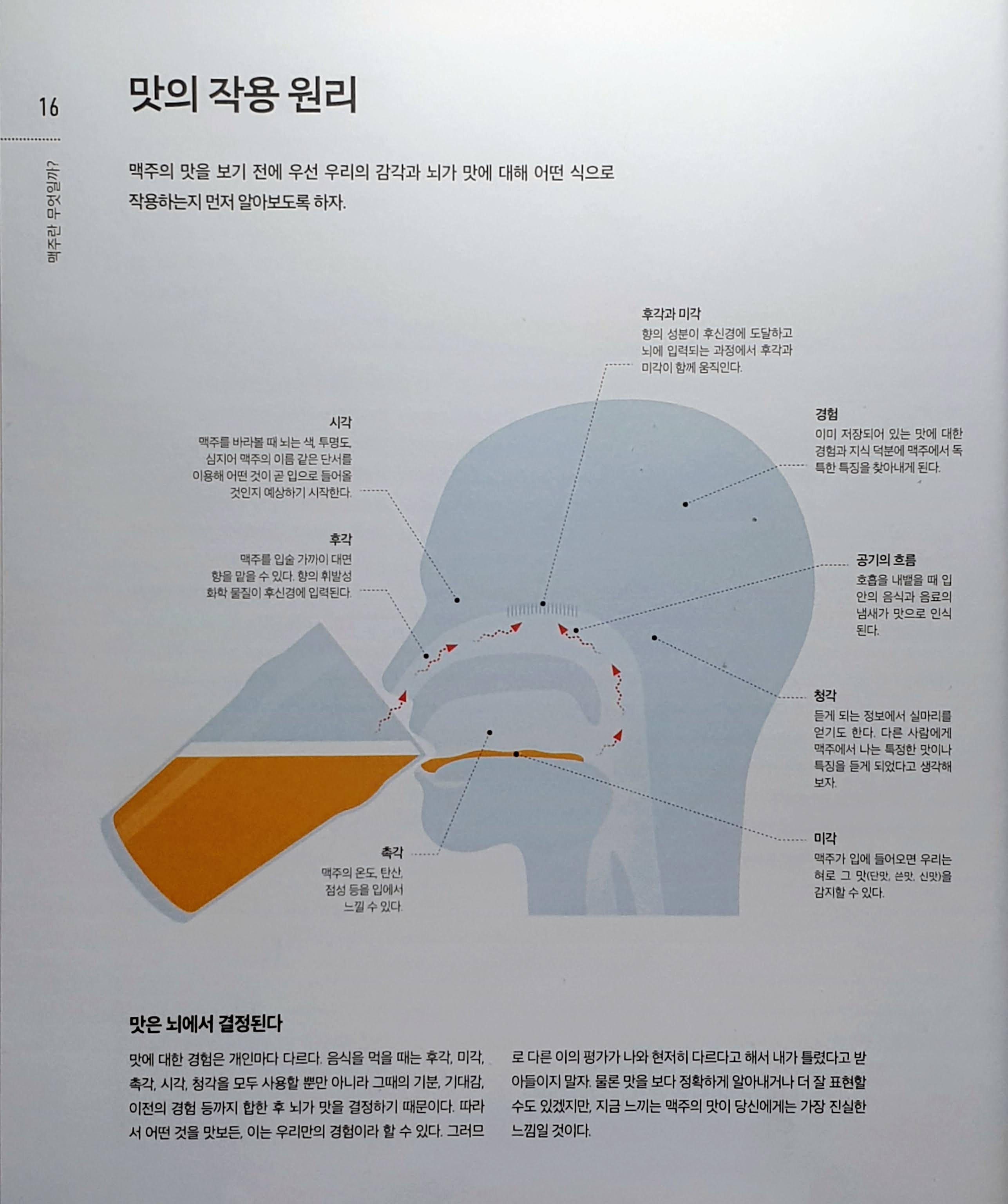 맥주를 마시면서 각 감각이 어떻게 맥주의 맛을 느끼게되는지 그 과정을 상세히 설명하고 있다.