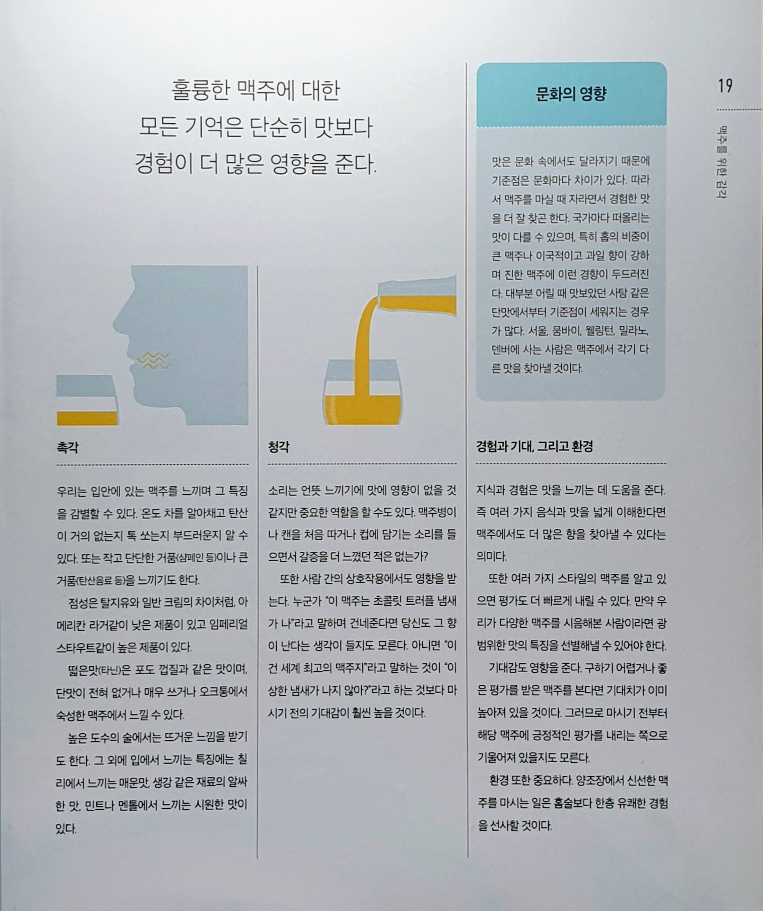맥주를 마시면서 각 감각이 어떻게 맥주의 맛을 느끼게되는지 그 과정을 상세히 설명하고 있다.