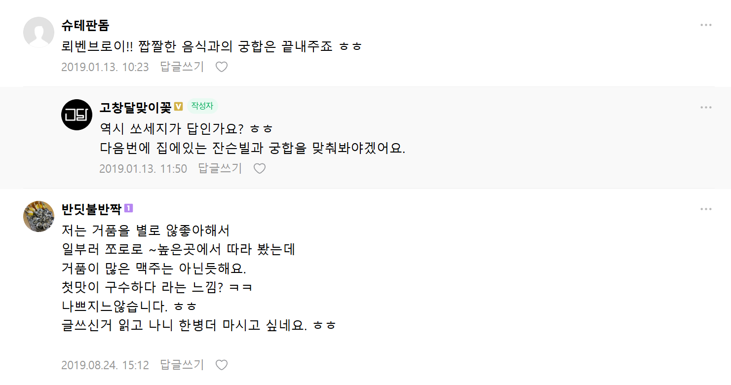처음 잔에 따를땐 일부로 거품서버를 이용했는데 두번째 그냥 따랐는데도 부드러운 거품이 꽤나 괜찮네요.
