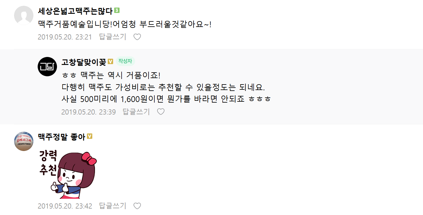 물론 가격대에 맞게 특별한 향이나 맛을 보여주진 않지만 엉뚱한 맛으로 실망감만 느끼게 하는 맥주들보다는 차라리 다른 맛은 가미하지않은 정직함이 마시기엔 더 편하고 좋은거 같습니다.